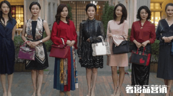 “因为没背爱马仕,顾佳被太太圈从朋友圈照片里裁掉”,剧中,沪上的富豪“太太圈”将其视为进入圈子的敲门砖,不同的款式代表了身份和等级。导致在微博上#阔太比拼圈#、#顾佳买包#、#爱马仕上流社会敲门砖#各种话题层出不穷。