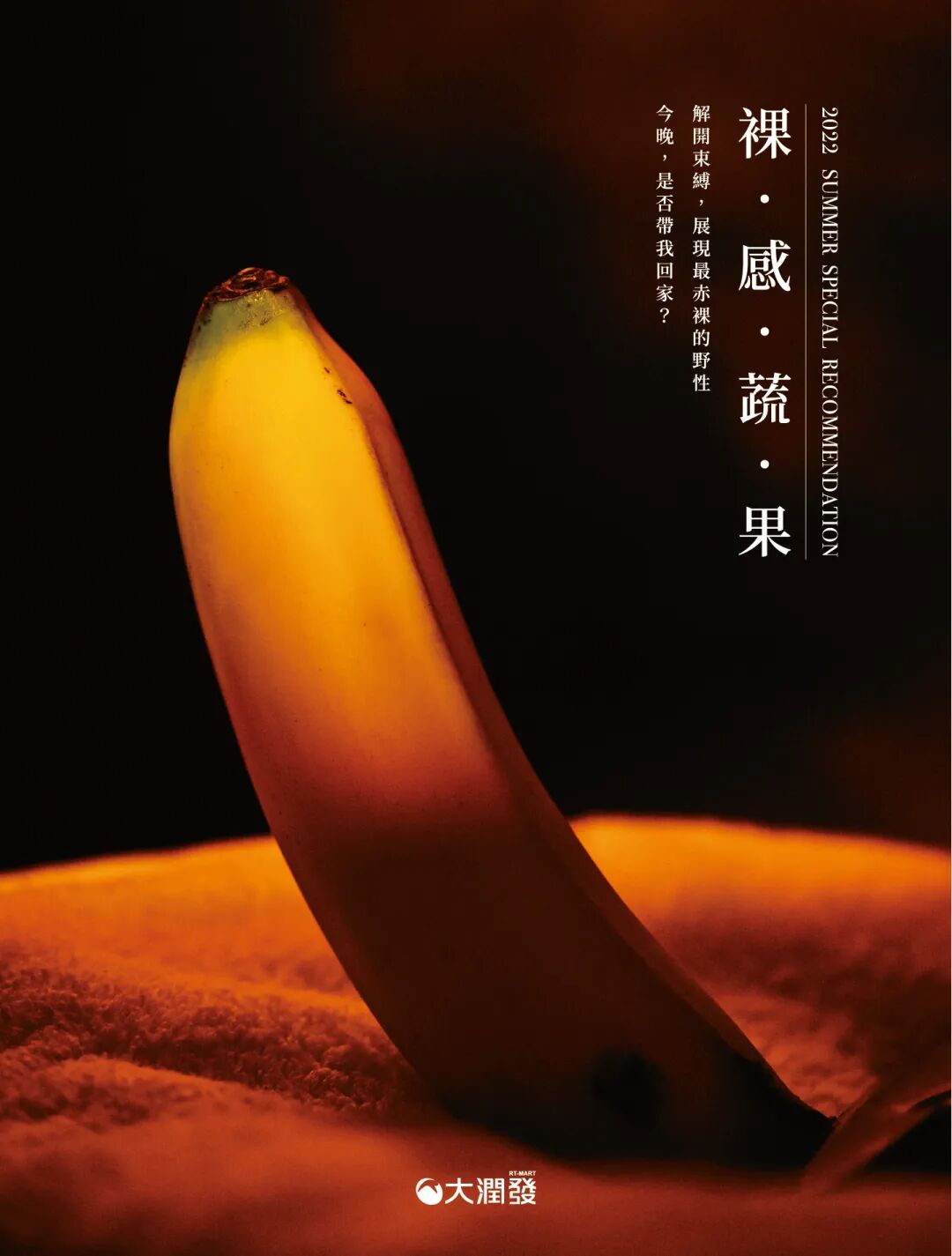 单纯看确实很有诱惑感,蔬果看起来也很好的样子。但这些写真图,基于女性、男性的身体层面来呈现所谓蔬果的全裸感,除了图片本身,在文字表达上确实给受众带来很强烈的不适感,毕竟去超市买蔬菜的不仅有大人还有小孩。因此,大润发想要表现的全裸效果尽管能被民众get到,但看完之后倒很难让人联想到蔬果,感觉类比杜蕾斯、杰士邦等品牌的广告了。