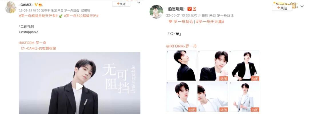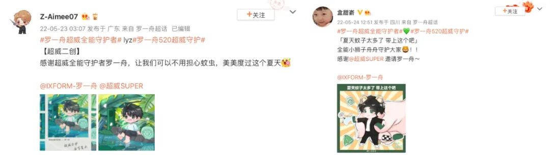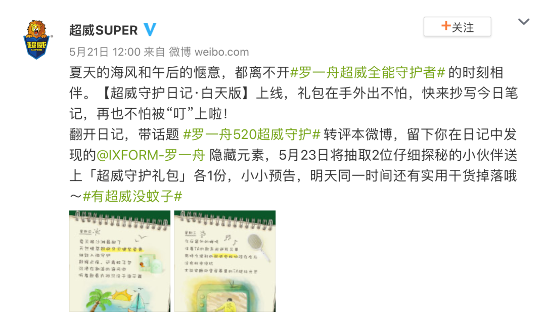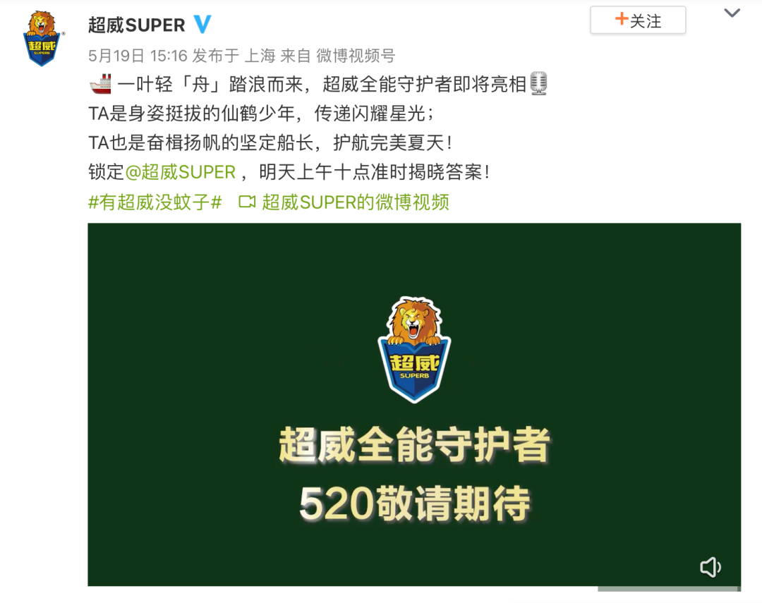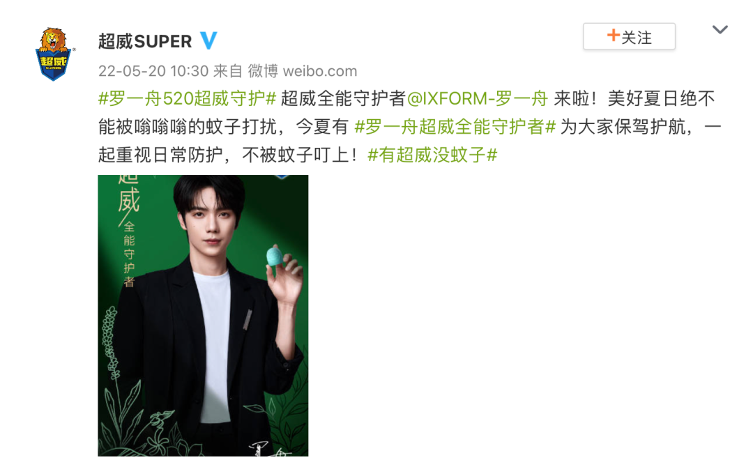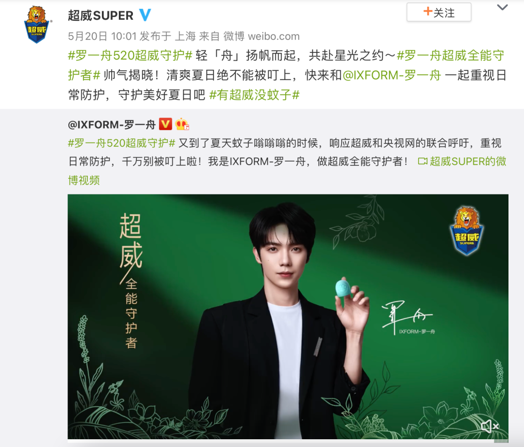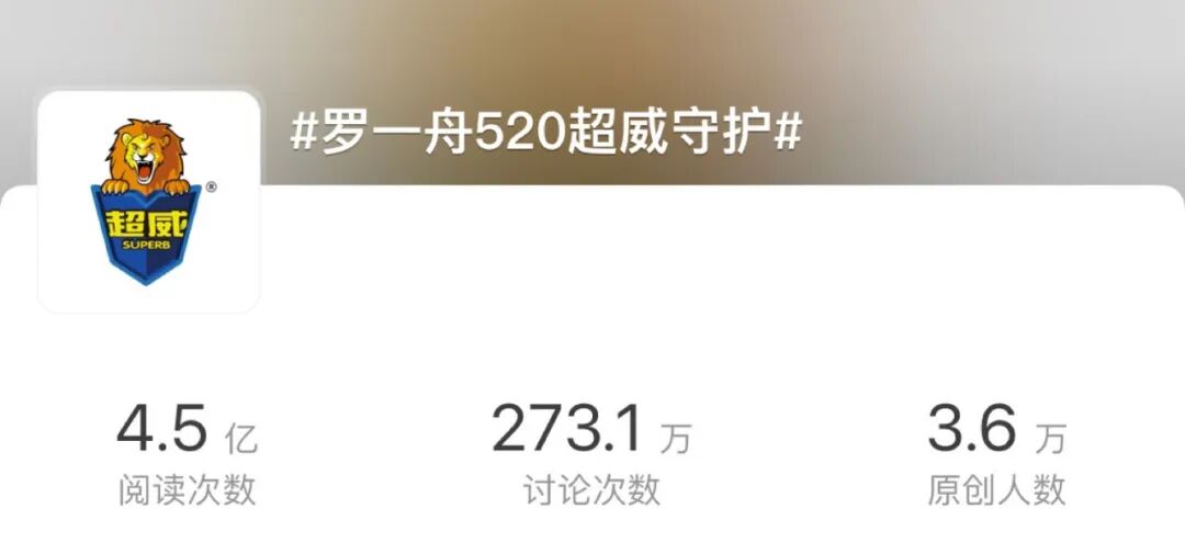 近日,超威官宣罗一舟为品牌全能守护者,原创微博话题#罗一舟超威全能守护者# 和#罗一舟520超威守护# 共获得9.5亿+曝光,超预期2375%,话题累计讨论量近548w!超威利用场景化种草精准切中用户喜好,吸引全域关注,成功实现效果最大化!