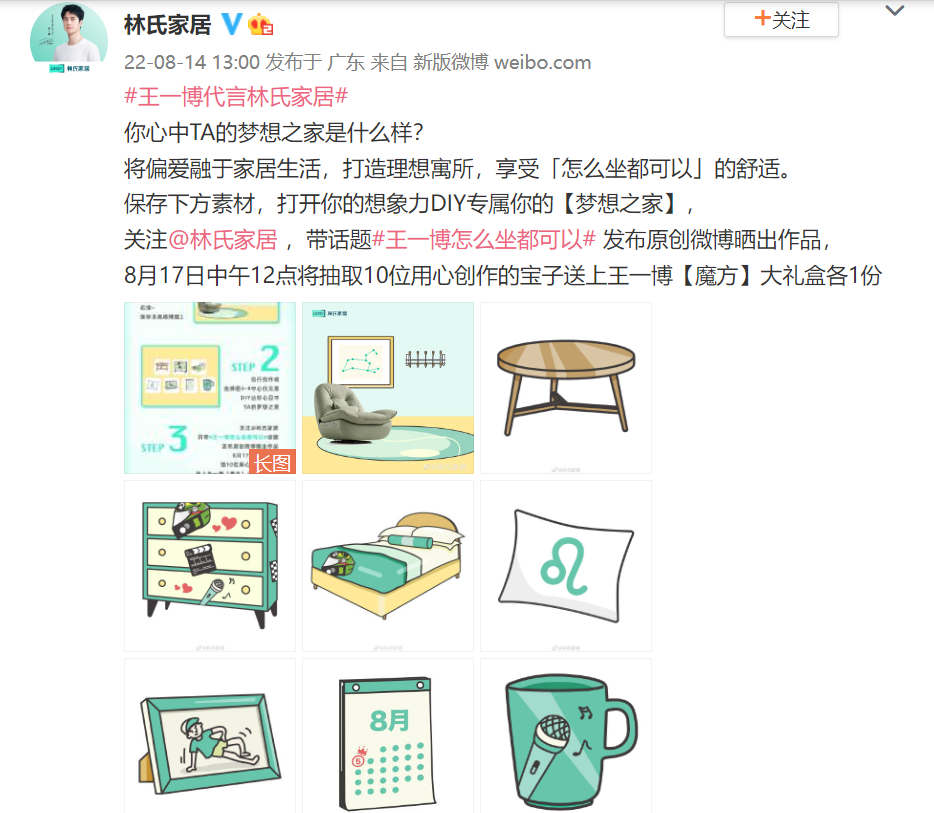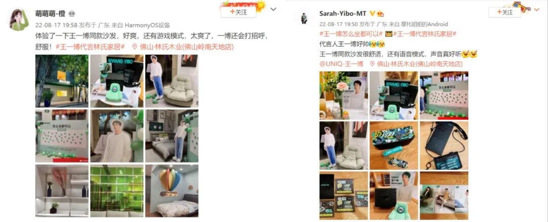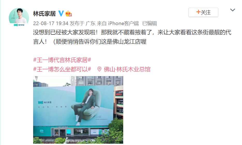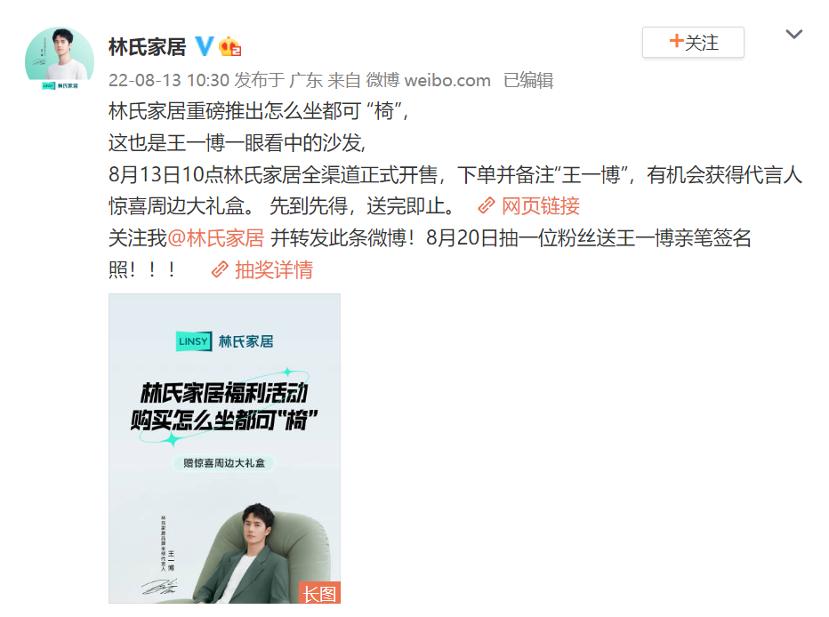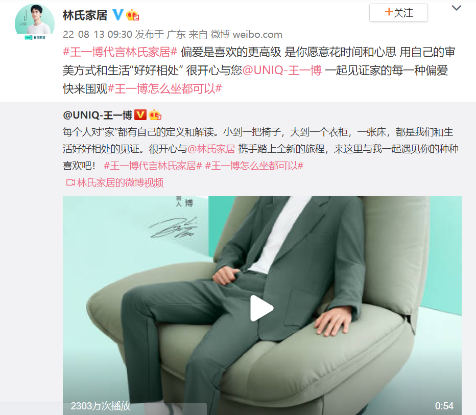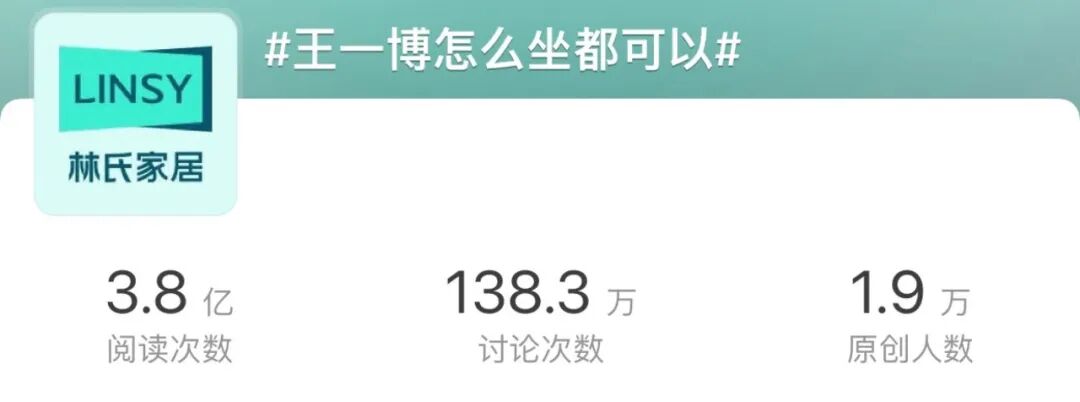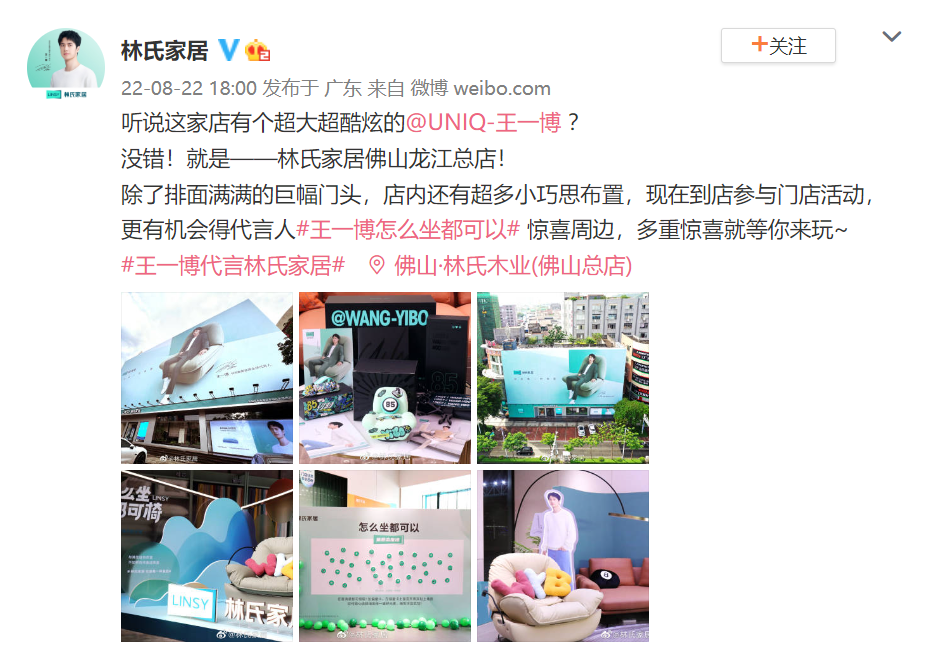 近日,林氏家居官宣王一博为品牌全球代言人,原创微博话题#王一博代言林氏家居# 和#王一博怎么坐都可以# 共获得9.8亿+曝光,话题累计讨论量超283.4w!林氏家居通过线上线下同步宣传,把控用户喜好、调动路人需求,从而吸引全域关注引爆声量,成功将主推产品「怎么坐都可椅」扩散出圈!