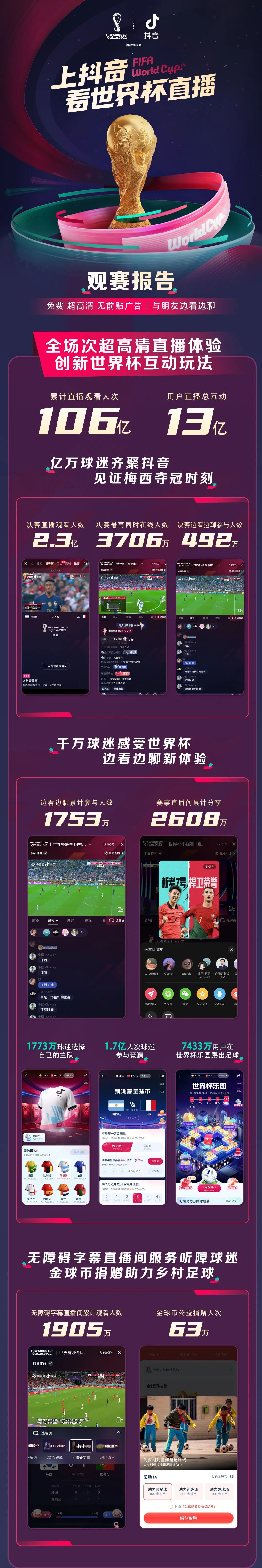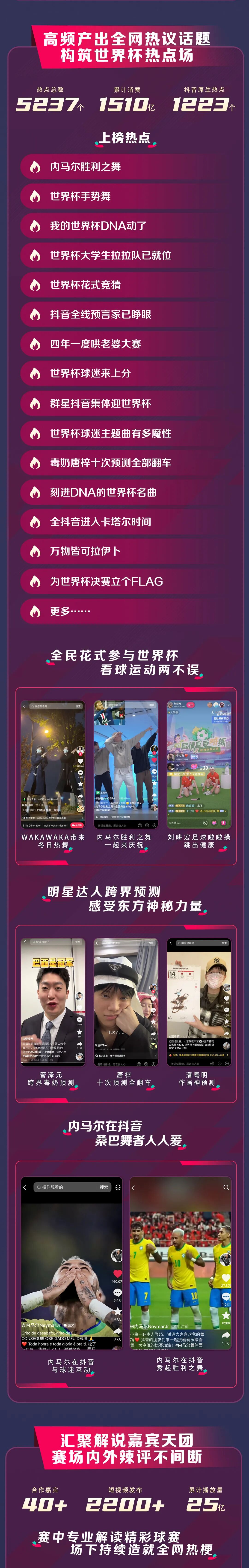 世界杯的热度有多高,先来看一组抖音在世界杯期间的数据:世界杯直播累计观看人次106亿,用户直播总互动13亿;世界杯成为流量的聚宝盆,一到晚上,几乎都被世界杯刷屏。不用怀疑,抖音与世界杯的第一次相遇,让这个略显萧条的冬天,平添了不少精彩与传奇。值得一看的是,这份精彩,不仅专属于用户,更为品牌制胜世界杯,颠覆传统体育营销模式认知,推动品牌数字化走向更为深远的方向,开出了轻快的一枪。