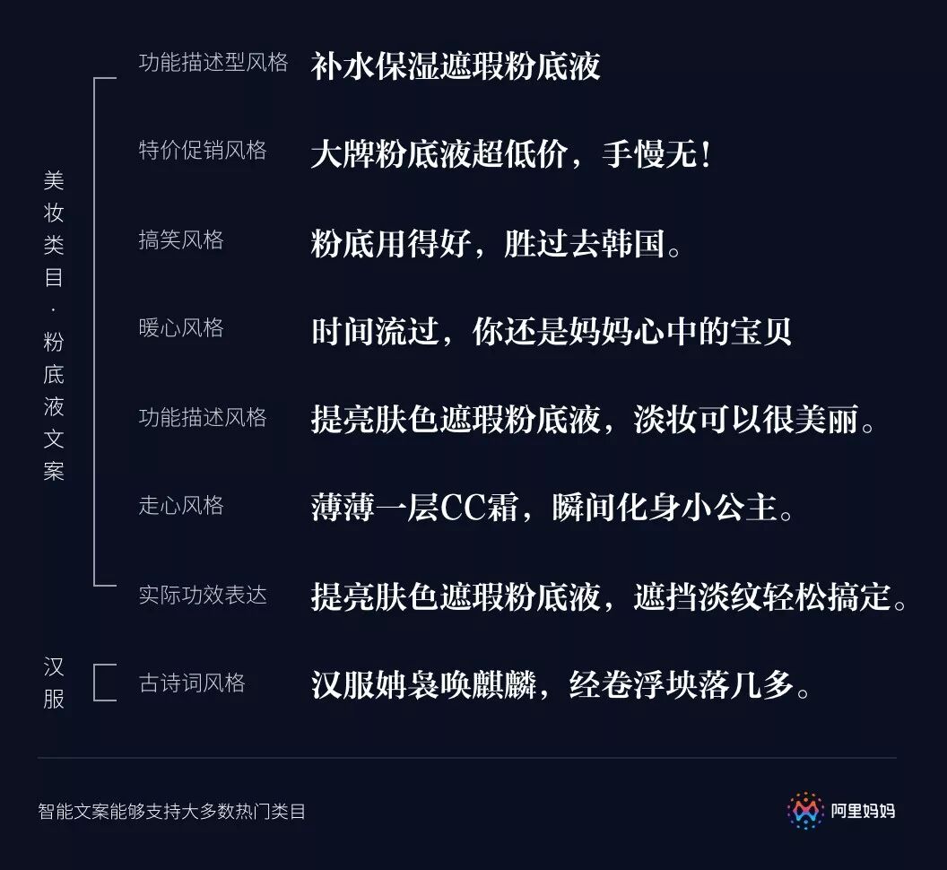此外,阿里妈妈还在戛纳国际创意节上发布“AI智能文案”产品,可以根据商品、淘宝天猫的内容写文案,一秒20000条文案说来就来。就这个速度,又可以吊打很多文案。