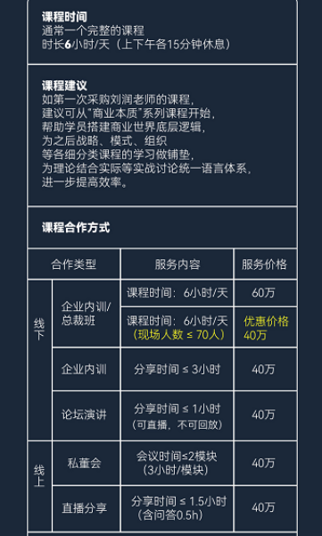 蓝鲸财经记者查询发现,刘润本人可以到公司内部或活动现场分享授课。一门完整的企业内训课程,70人以内报价40万,超70人报价60万,课程时长为6小时。课程包含《全面领导力》《建设团队》《商业模式致胜》等。