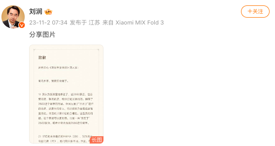 最终,在质疑和信任危机发生5天后舆情愈演愈烈时,11月2日早上7时,刘润在微博发文致歉,他表示,“调研完案例,我和创始人确认后,没有实地验证数据,或者和同行交叉验证数据。这是大家质疑最大的点,这是我的错。”