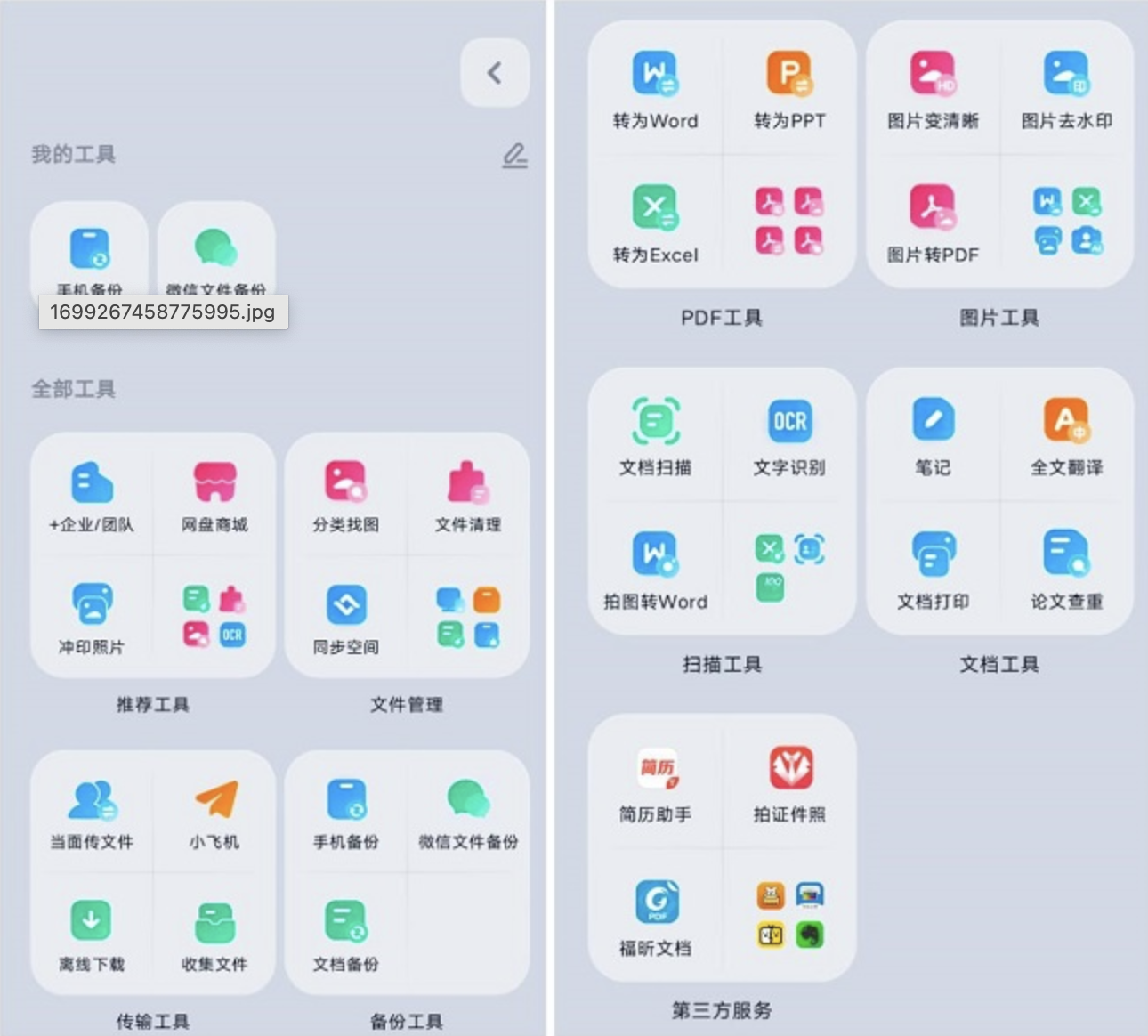 除首页改版之外,百度网盘还首次开放了“左一屏”,用户只需右滑屏幕即可进入常用工具“聚集地”。“左一屏”包含了Pdf转Word、PPT、Excel等Pdf工具,分类找图、文件清理、同步空间等文件管理工具,图片去水印、变清晰等图片工具,论文查重、全文翻译等文档工具。全新的百度网盘让用户无需先找到文件再进行操作,而是直接从工具入手,大幅提升使用效率。