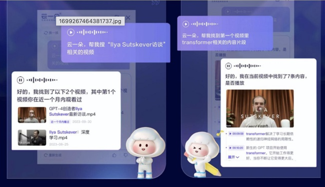 同时,百度世界大会现场李彦宏展现的百度网盘云一朵智能助理,也出现在了首页下方的中央位置。点击“云一朵”,只需一句话,就能对网盘内的文件、图片、视频实现快速搜索、智能摘要、金句提炼,让过去往往需要五步的操作缩减为两步以内,为用户带来“AI原生应用”的真实体验。例如,当用户对云一朵说帮我搜“Ilya Sutskever访谈相关的视频”,云一朵便可根据对话描述,快速找到OpenAI首席科学家llya的采访视频。当用户继续反馈“帮我找到第一个视频里transformer相关的内容片段”,云一朵便可精准定位到其中有关神经网络的内容,甚至可在长达43分钟的英文访谈中,精准提炼出llya的金句“学习统计规律比看到表象要重要得多”。