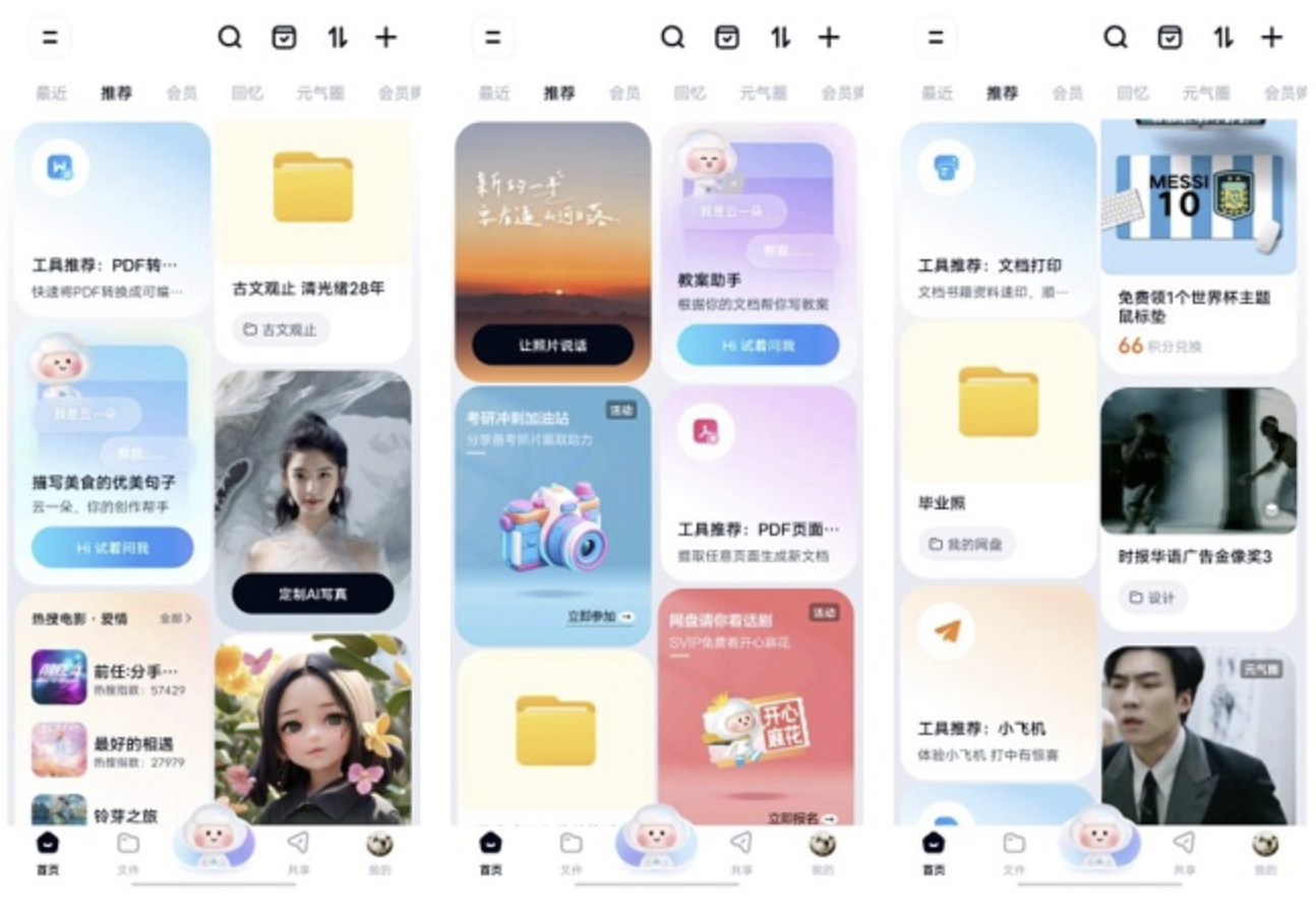 值得一提的是,本次百度网盘还打造了更为年轻化的UI设计界面,通过“多巴胺”配色、圆角卡片、玻璃及亚克力质感材质的加入,实现更为简约现代的图标设计、活泼时尚的字体设计、高级纯净的界面风格,在色、形、字、质四方面打造出更符合年轻审美的现代化页面。