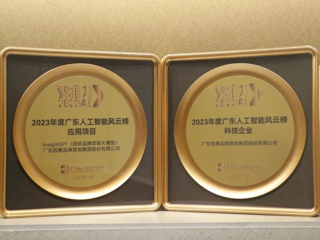 12月15日,在2023年粵港澳大湾区人工智能产业大会上,凭借在营销AIGC领域的探索实践和应用,因赛集团获年度广东人工智能风云榜科技企业,InsightGPT获年度广东人工智能风云榜应用项目。同日,第二届广州国际品牌节暨2023第二十二届中国广告与品牌大会上,因赛集团荣获“年度数字科技品牌”称号。