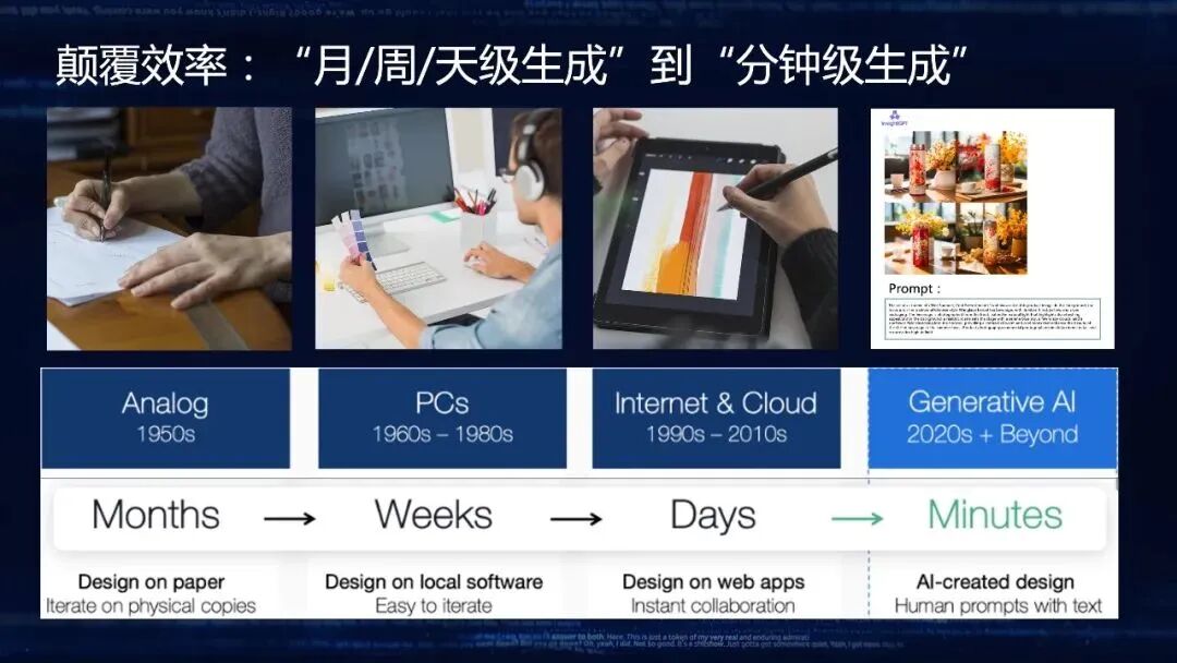 回顾过去40年当中每一次重大的技术变革:PC时代,营销方案所需时间从月拉到周;移动和手机互联网时代,这一周期从周拉到天;在AIGC以及超级智能时代,有可能实现由小时级到分钟级的转变,在时间上做到极大的压缩。