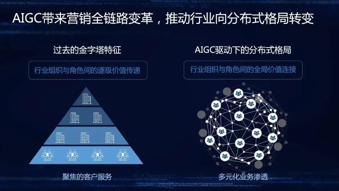 营销链路的自动化将放大专业能力,以往只有头部专业公司团队能提供的方案和服务,现在中腰部的企业也能够做到,甚至一个人+多个AI工具就能够完成营销创作,内容的制作会慢慢变成网状型的结构。AIGC驱动下的营销格局将向分布式格局发展,渗透多元业务,形成行业组织与角色间的全局价值连接。