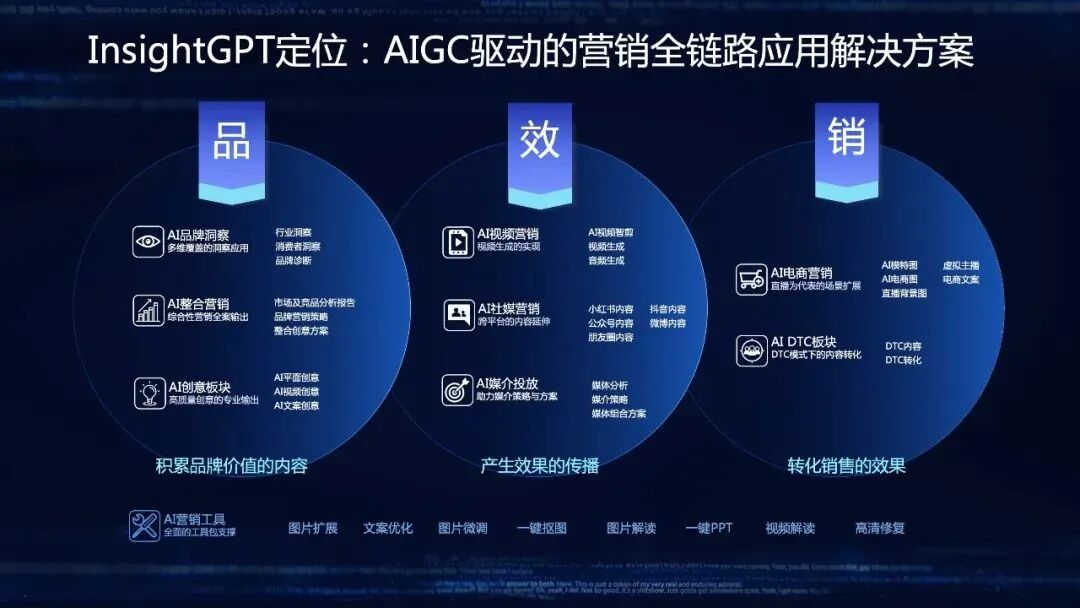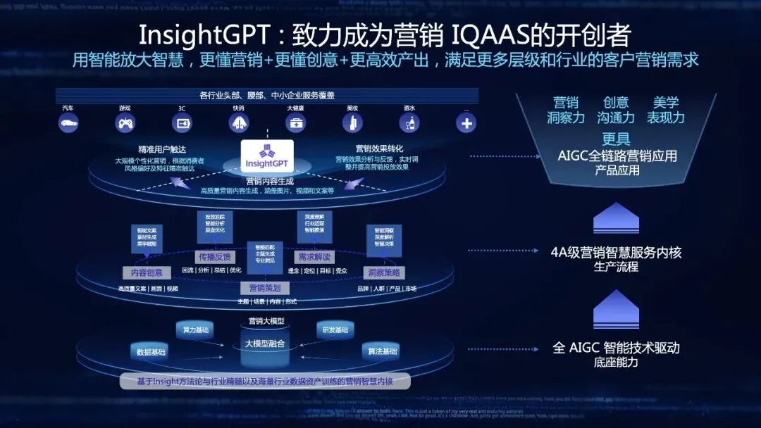 InsightGPT营销行业应用级别的大模型,不是局限在图像类、视频类或者其他某个单位维度,而是根据营销服务整合的具备AIGC智能技术底座驱动的行业大模型。