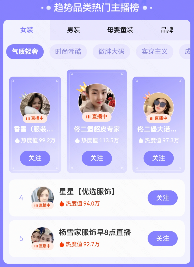 @潮派娇娇(大码电商) 也是表现很亮眼的商家,其自营高端大码女装,是本次活动“大码定制风保暖推荐官”。活动期间,主播娇娇发布了140条带活动话题的短视频,平均视频曝光次数对比上月同期增加31%,其中9次登上女装大码定制榜单TOP1。