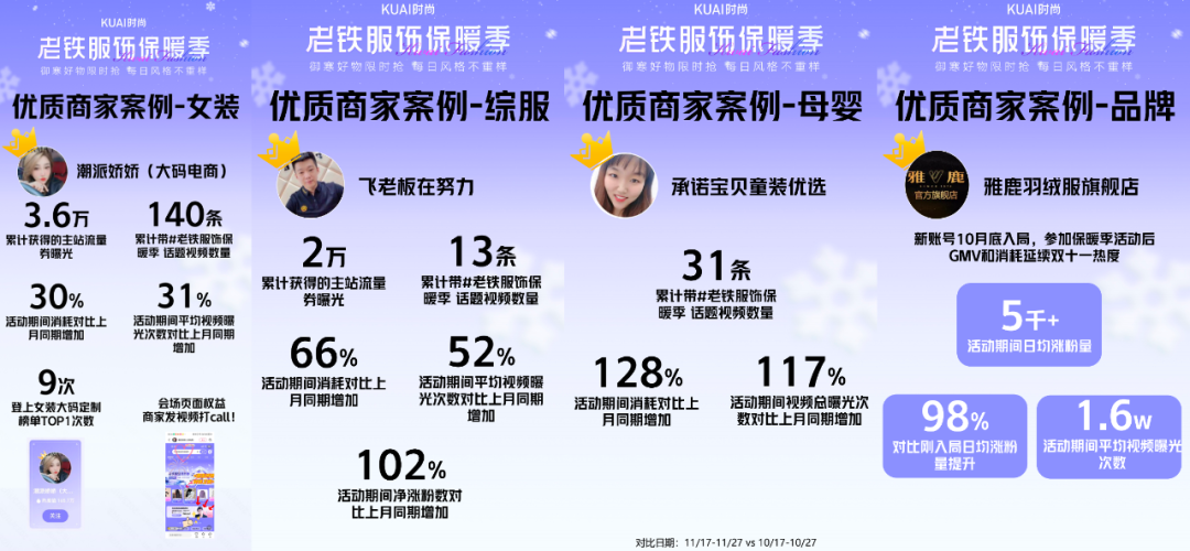 在“老铁服饰保暖季”话题活动中,由官方运营团队发起,众多垂直达人积极相应号召,用户广泛参与发布御寒好物单品买家秀视频。多重资源、多样玩法的叠加,让“老铁服饰保暖季”活动取得亮眼成绩,官方战报显示,活动总曝光近20亿,话题“老铁服饰保暖季”总播放量超5亿,活动更是带动用户作品发布量达到1.2万+;参与商家在活动期间共创52.2亿销售额,比去年同期提升43%。