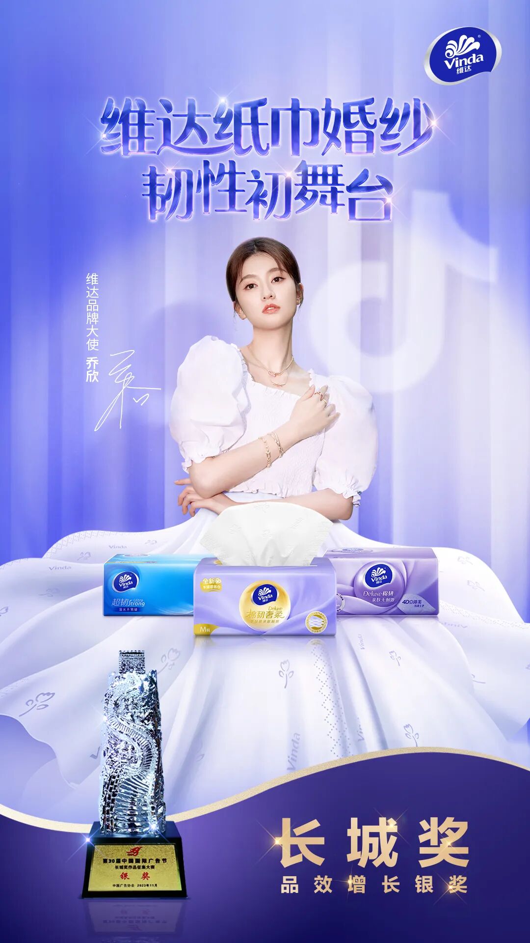「维达纸巾婚纱韧性初舞台」依托明星种草+超头部达人种草+线上线下超级硬广的加持,实现爆发式拉新,并搭载明星直播+达人直播+品牌自播的,实现销售转化,“品+效”双管齐下,强势输出「韧性」的品牌心智,同期超量推动品牌抖音站内销售,是一个实现品牌资产、人群资产与效果转化大爆发的一次整合营销项目。除了长城奖,该项目今年还在金瞳奖内容实效电商类与金投赏公关整合传播类等捧杯而归。