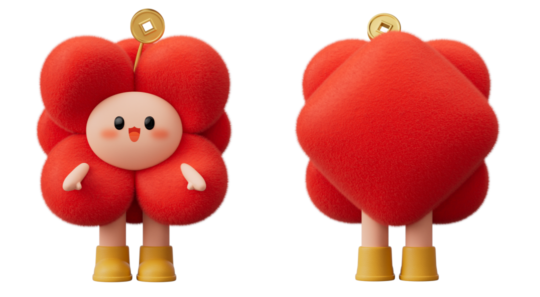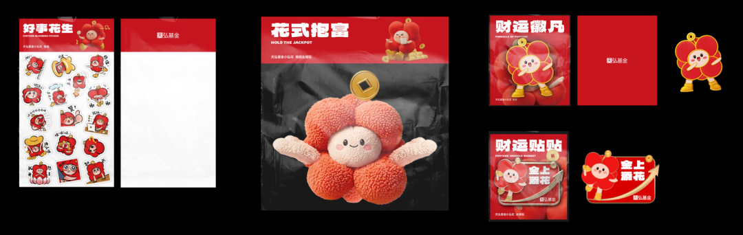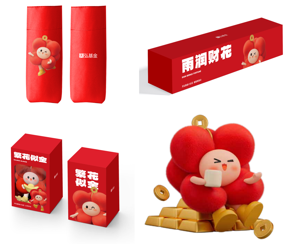 在整体的视觉设计上,我们以象征着“希望与新生”的山茶花作为基础形状,寓意着天弘基金“为天下人理财”的美好初心,我们再在天弘基金logo中提炼出方块元素,将它升级进化成“小花包”神器。它装载着可以解决各种理财需求的智能金融道具,灵活应对多元场景和用户需求。