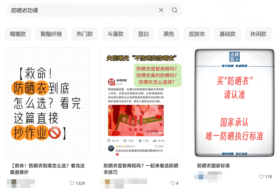 一位服装博主表示,她选购防晒装备主要考虑四个很简单维度:价格合理、防护可靠、透气舒适、设计时尚,一眼看得过去再细究具体参数价格。