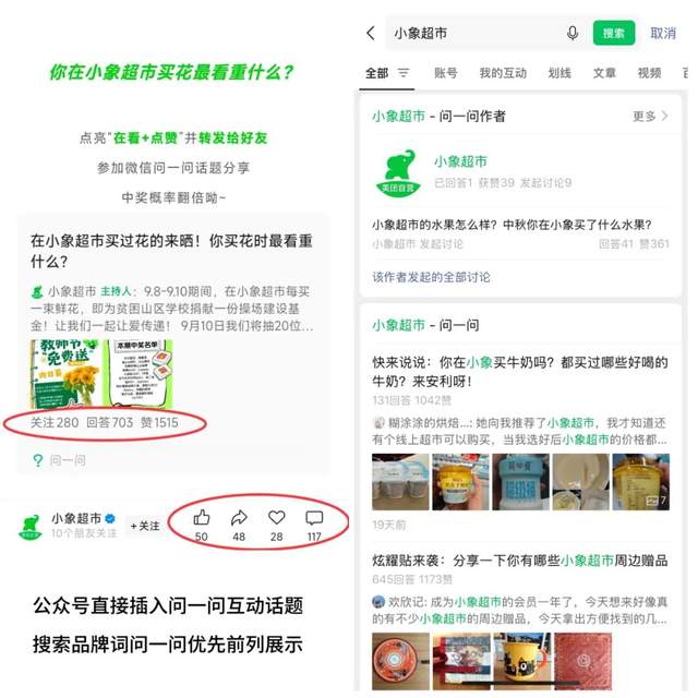 品牌结合节日语境和使用场景,发动粉丝、广大路人的力量推荐自家好物,优质分享的用户有机会获得品牌提供的礼包礼券。比如小象超市这次提供了 1010 盒可生食鸡蛋福利,激励大家参与回答,还玩了“一代人有一代人要领的鸡蛋”网络梗。