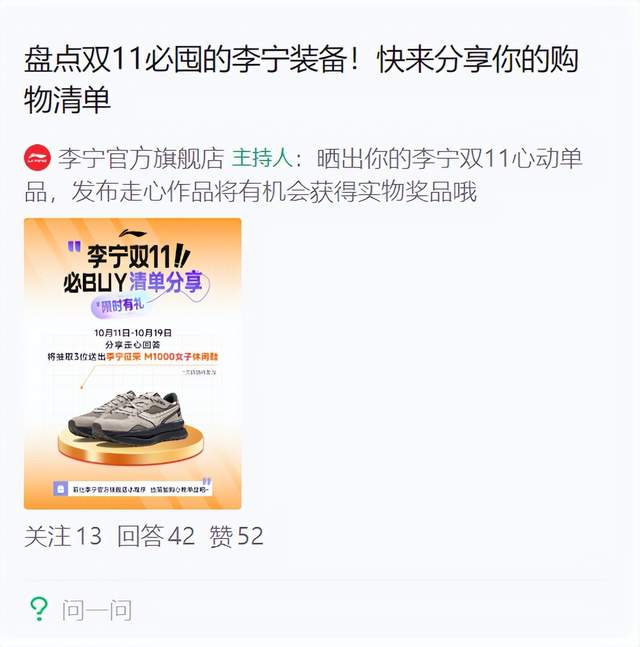 我们也看到李宁已经开始布局双十一的有奖互动问一问话题了,品牌方不妨在今年双十一开启这种新玩法。