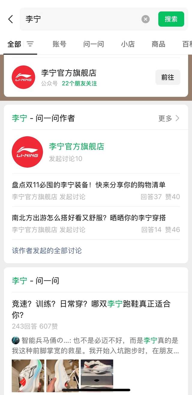 作为较早布局「微信问一问」的品牌,李宁已经初步实现了品牌内容资产、电商渠道和用户资产的互通串联。